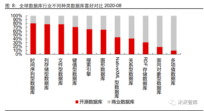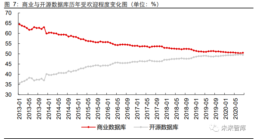 同时,目前数据库行业不同的数据库之间喜好的比例也不相同。相比于传统商业数据库 的主要类型稳定,在开源数据库中新兴数据库类型更受欢迎。这一整体趋势说明全球数 据库这一市场已经从传统的商业数据库为主的格局逐步转向商业与开源数据库混合的 态势。