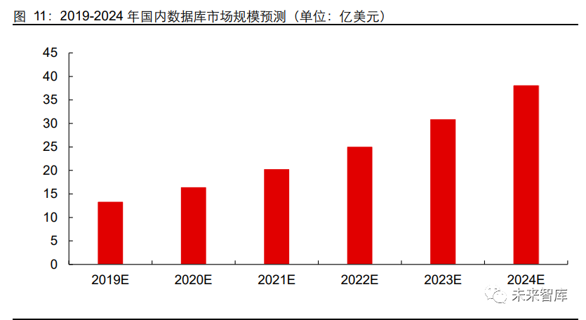 中国数据库市场持续增长,云数据库占比将提升。根据 IDC 在 2019 年发布的市场预测, 2019年中国关系型数据库软件市场有望达到13.4亿美元,传统本地模式为7.9亿美元, 公有云模式 5.5 亿美元。预计到 2024 年,整体市场规模将达到 38.2 亿美元,5 年整体 市场年复合增长率(CAGR)为 23.3%。其中公有云关系型数据库软件市场将保持 35.5% 复合年增长率,到 2024 年中国公有云关系型数据库软件市场将达到 25.1 亿美元。