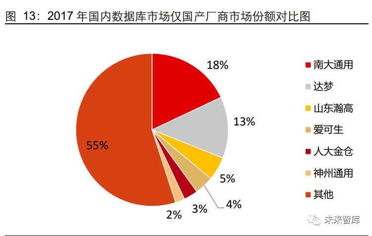 目前的数据库市场由于技术门槛较高,且长期被国外企业垄断大多数市场,因此国内厂 商的市场份额较少。以 2017 年市场数据来看,中国数据库市场主要由四家外国企业占 据最多市场份额,分别为 Oracle、IBM、Microsoft、SAP,四家合计市场份额高达 64.8%。