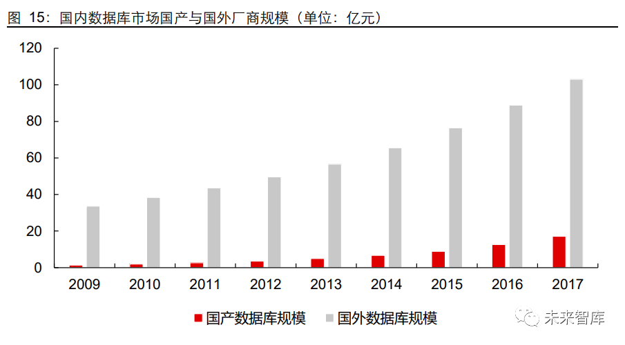 目前为止,替代占据主要市场的国外商用的进程总体上已经稳步推进。如阿里、华为等 厂商逐步开发了更安全、自主、可用的云平台产品用于数据迁移和更为节约成本的数据计算技术。从 2009 年国内“去 IOE”进程开始到 2017 年期间,国产数据库产品占国内数 据库市场的份额正在飞速提升。尤其在 2016 年至 2017 年间,年增长率高达 36.33%, 远超同期国外数据库产业在国内市场 15.98%的增速。预计未来,随着“去 IOE”进程的全 面化,这一占比将继续提升。