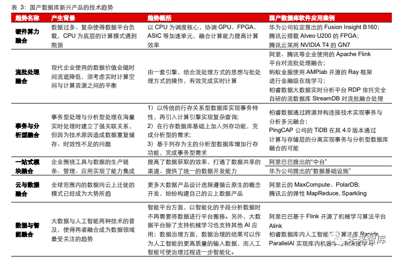 目前新兴国产数据库的底层框架已经日趋成熟,大数据技术已经成为了支柱型的基础设 施。未来发展数据库产业发展的方向也逐渐转向提升效率、上层应用部分。当前,新兴 国产数据库产品正逐渐体现了六种不同方向的技术融合的趋势,分别为硬件算力融合、 流批处理融合、事务与分析型融合、一站式模块融合、云与数据融合、数据与智能融合。