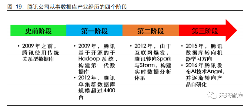 作为大数据这一领域的前沿探索者,腾讯自 2009 年就以来不断变革其数据库技术,从 开源化数据库到重视实时演算,再到机器学习与自主研发数据库产品的这十多年,腾讯 在数据库这一领域积累了相当多的经验。如今,腾讯已经成功开发了 20 多种数据库, 并以每年 5 个大产品、50 种功能的高速继续在数据库相关产品研发道路上推进。