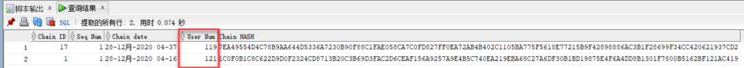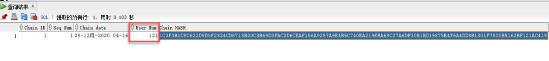 接下来我们通过数据字典查看一下区块链表的变化。我们发现多了一条记录,并且user num是119.