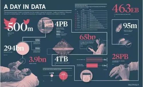 根据世界经济论坛披露的资料显示,截至2020年,全世界总的数据量达到44个泽字节(ZB,是艾字节EB的1024倍),这意味着其数据量是可观测宇宙中星星数量的40倍。而每天,互联网上产生50亿次搜索、发送2940亿封邮件、5亿条推特被发出。