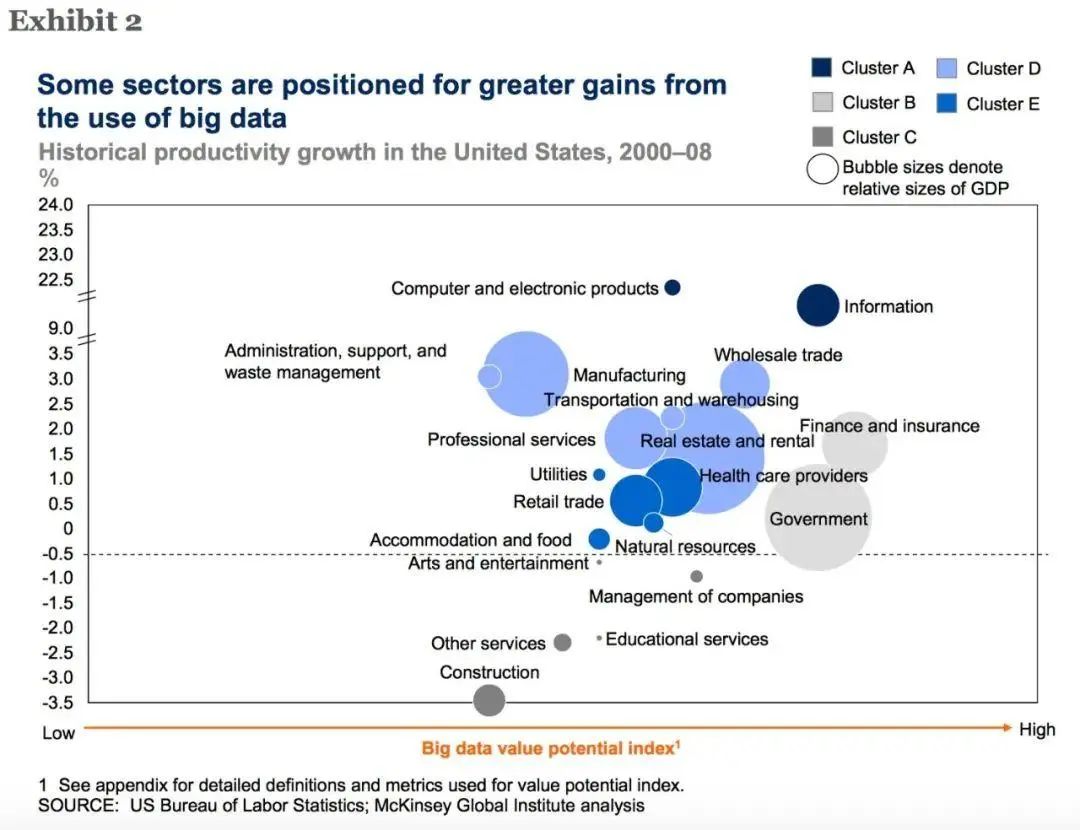 根据麦肯锡全球研究院(MGI)的研究,几乎所有的行业都可以从充分利用大数据中获益。大数据的正确使用能够让零售商的营业利润率提升60%;在美国,医疗保健行业创造性地使用大数据提升效率和质量,每年能多创造出3000亿美元的产值。