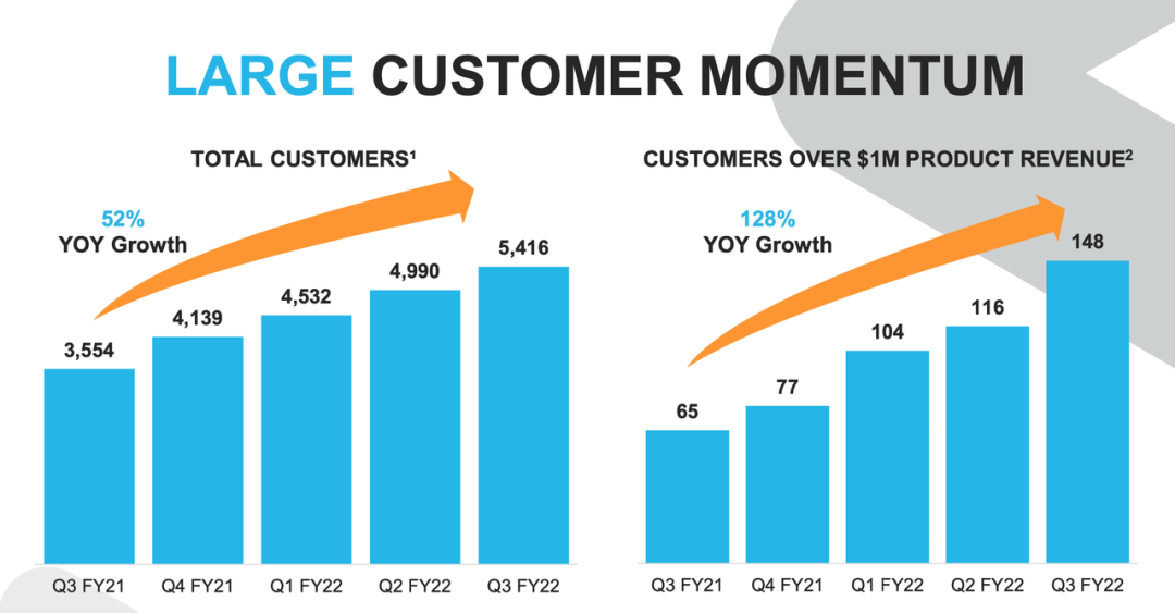 当然有了客户之后,如何增长加留存是维持营收增长的关键。2022年Q3财报显示,Snowflake大客户的增长和老客户的留存率增长都非常明显。