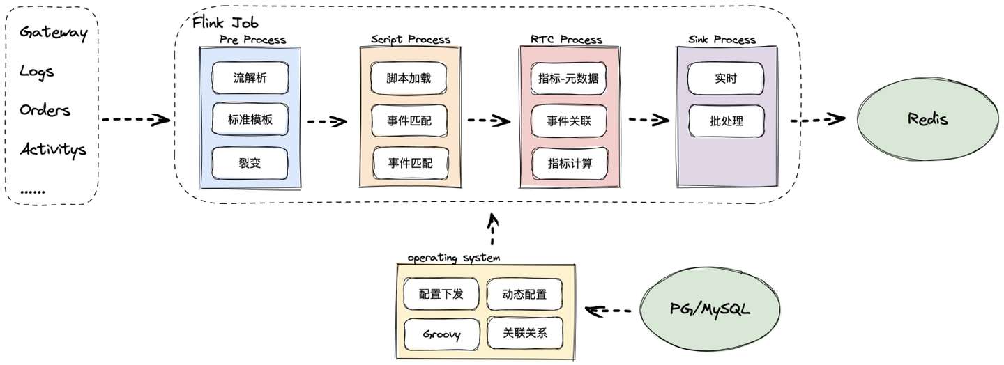 依然同上面两个算子,实时计算算子依赖 channel + eventCode 查找到对应实时特征元数据,一个事件可能存在多个实时特征配置,运营平台填写好实时特征配置后,依据缓存更新机制,快速分发到任务中,依据 Key构造器 生成对应的 Key,传递下游直接 Sink 到 Redis中。