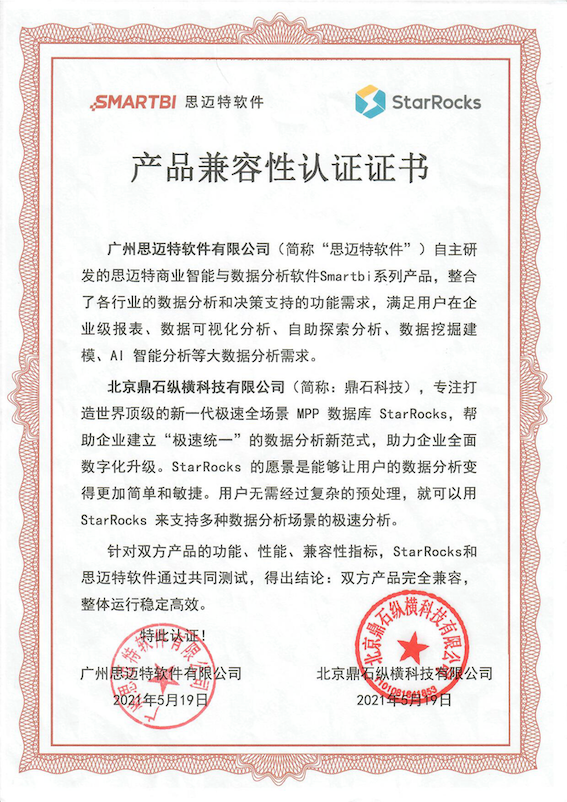 成立两年多来,StarRocks 一直致力于打造“极速统一”的全新数据架构,为数据分析带来革命性改变。此次 StarRocks 与 Smartbi 的兼容测试认证,为行业客户提供基于良好生态的数据分析产品和一体化解决方案奠定了基础。