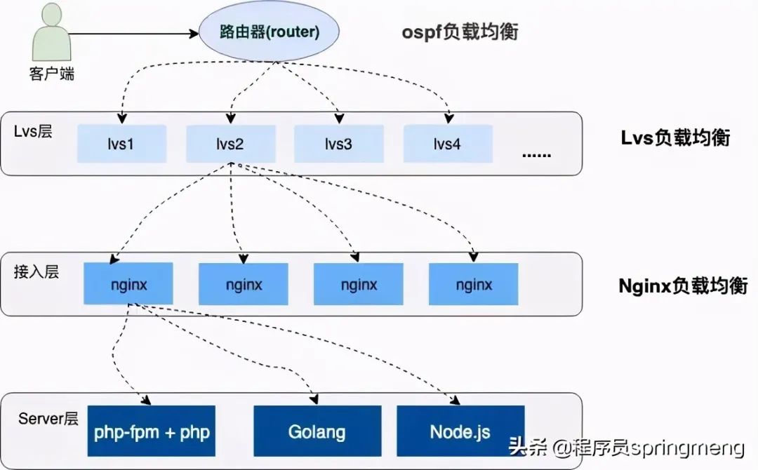 上图中描述了用户请求到服务器经历了三层的负载均衡,下边分别简单介绍一下这三种负载均衡: