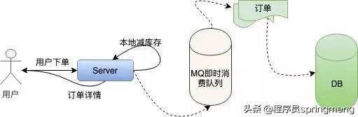 接下来我们对单机扣库存的方案做优化:本地扣库存。我们把一定的库存量分配到本地机器,直接在内存中减库存,然后按照之前的逻辑异步创建订单。改进过之后的单机系统是这样的: