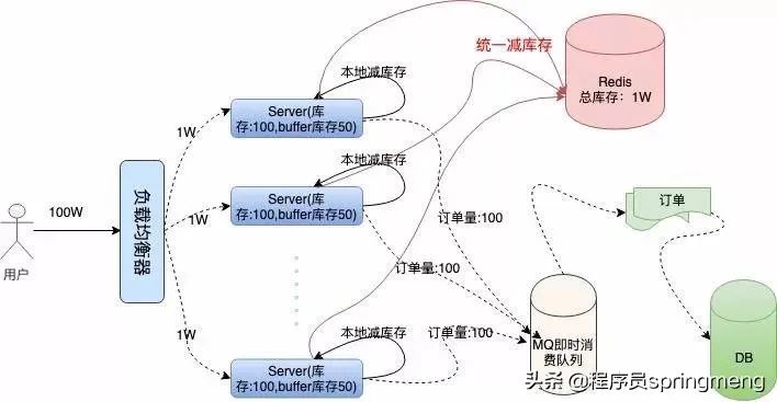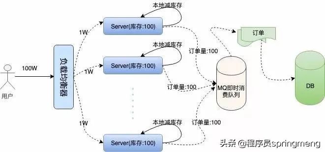 上面我们提到了nginx的加权均衡策略,我们不妨假设将100W的用户请求量平均均衡到100台服务器上,这样单机所承受的并发量就小了很多。然后我们每台机器本地库存100张火车票,100台服务器上的总库存还是1万,这样保证了库存订单不超卖,下面是我们描述的集群架构: