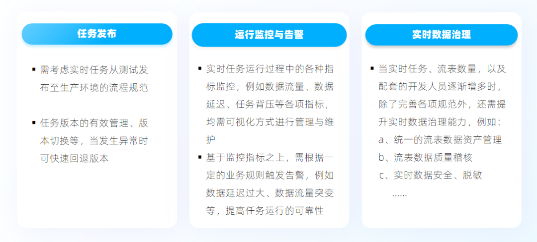 第四步是管理与监控,可以从任务发布、运行监控与告警、实时数据治理这3个部分入手。