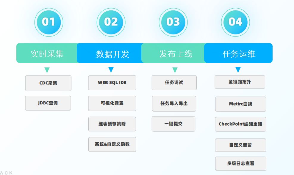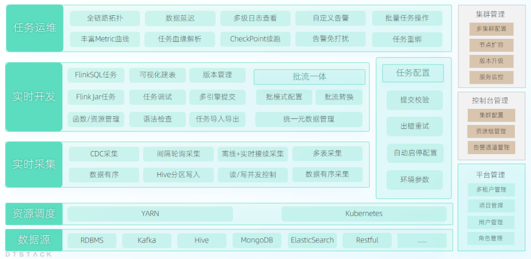 内含实时开发全链路工具,采集、计算、运维一体,降低客户使用成本,降低实时计算门槛。