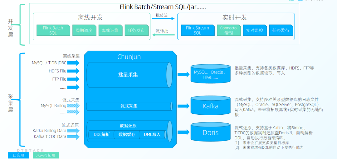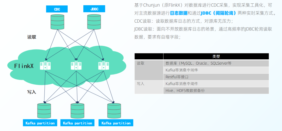 基于Chunjun(原FlinkX)对数据库进行CDC采集,实现采集工具化,可对主流数据源进行CDC(日志数据)和通过JDBC(间隔轮询)两种实时采集方式。