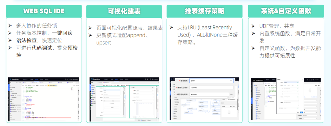 现在展示的是数据开发的一些基础功能,包括:WEB SQL IDE、可视化建表、维表缓存策略及系统&自定义函数,丰富的底层组件封装,界面化操作,降低开发门槛,使开发人员专注于业务逻辑处理。
