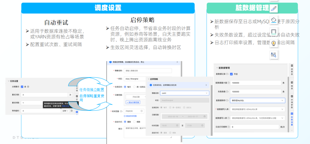 除了数据开发的基础功能之外,还有面向特定行业或场景的高阶配置,包括自动重试、自动启停、脏数据管理。
