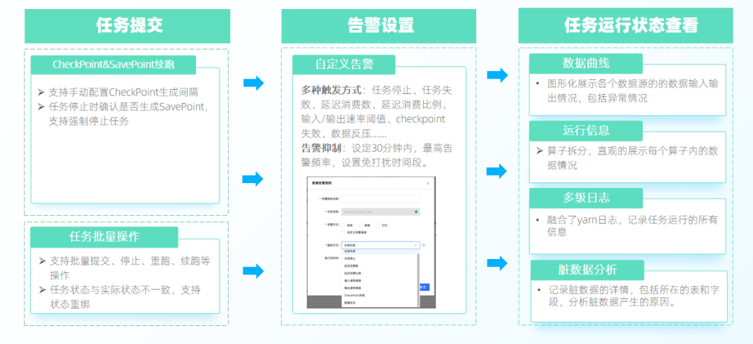 平台提供任务跨环境发布、代码调试、SQL校验、提交检查、自动启停、批量连接现存任务等丰富功能