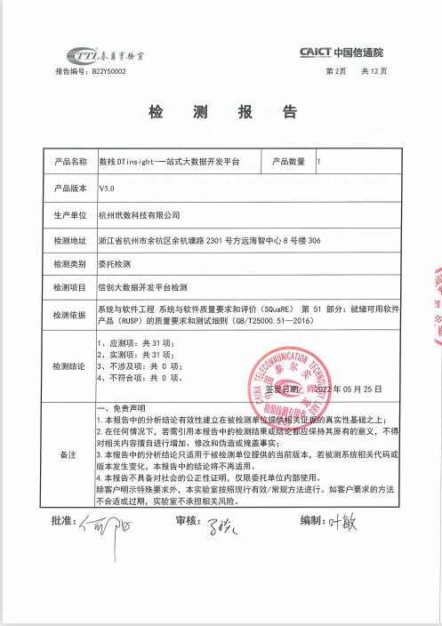 测试中,数栈DTinsight一站式开发平台运行在以鲲鹏920为CPU的计算服务器上,操作系统采用麒麟V10,共同构成金融开放平台业务系统的运行环境。在功能测试方面,适配验证范围包括集群资源查看、数据源管理、任务管理、资源管理、调度引擎、运维总览等共27个模块,检测项目100%全部通过,并取得了产品适配验证报告,表明数栈DTinsight完全具备支撑金融行业关键业务系统所需的各项能力。