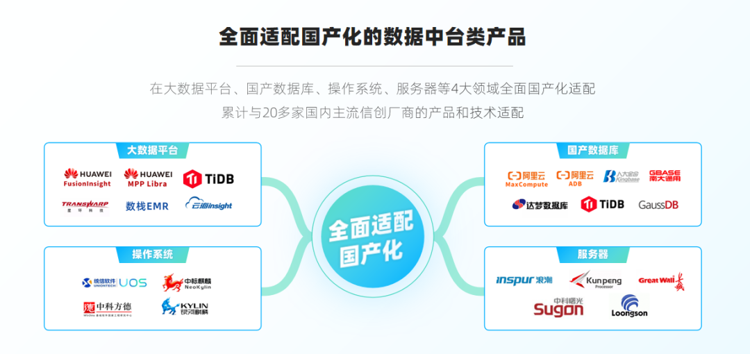 回顾袋鼠云信创实践历程,作为国产信创中的一员,数据中台领域兼容性的全方位领跑者,2020年起,袋鼠云数栈DTinsight正式启动在操作系统、大数据平台、数据库和服务器四大领域的全面国产化适配,至今累计已与包括飞腾、浪潮云、瀚高、华为、麒麟、达梦等20多家国内主流信创厂商完成产品和技术适配,并与光大证券这类的金融试点机构开展联合适配工作,完成数栈DTinsight全系产品的信创适配,共同推动行业信创发展。