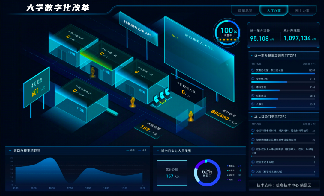 何为“1+5+2”?即1个数据中枢“一体化智能化公共数据平台”、5个数字综合工程“学科科研、教育教学、服务地方、后勤保障、党政管理”以及2大保障体系“制度规范体系”“安全防护体系”。通过袋鼠云一站式大数据开发平台数栈DTinsight、数字孪生可视化平台EasyV两大核心产品,温州大学完成了数据平台的一体化和智能化改造。