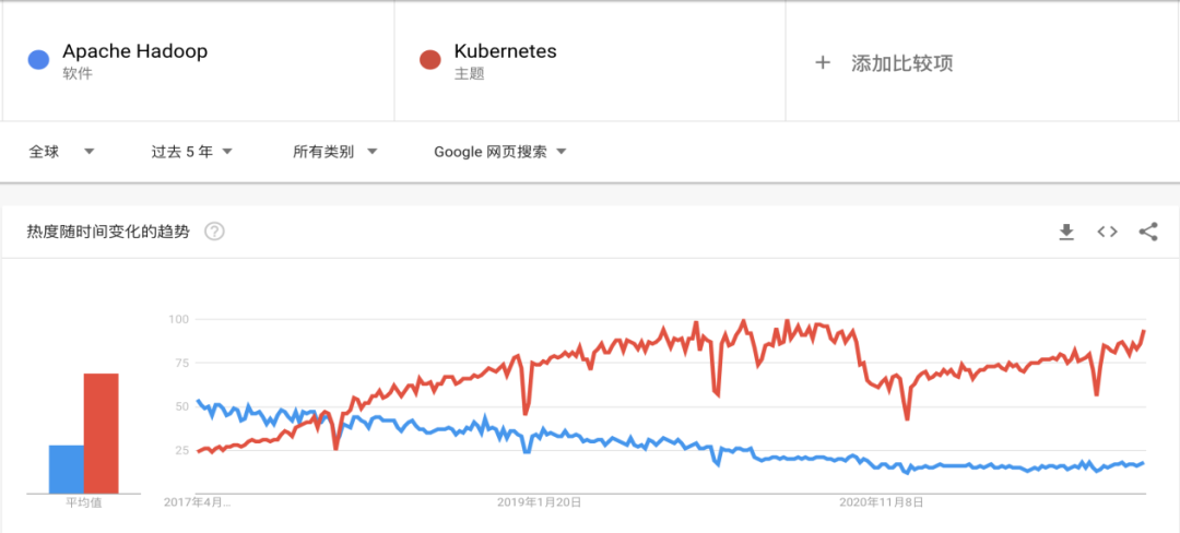 如下图所示,Google过去五年对于Kubernetes和Apache Hadoop热度统计结果展示表明市面上对Kubernetes的热情逐渐高涨而对Hadoop热度逐渐减退。