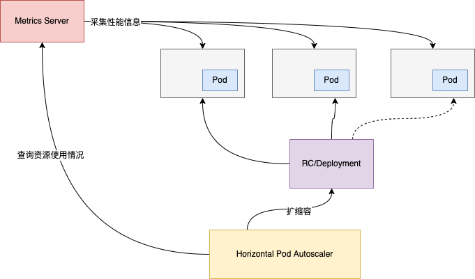 Kubernetes中的Metrics Server会持续采集所有Pod副本的性能指标信息,HPA控制器通过Metrics Server的API获取这些数据,并根据用户设置的自动扩缩容规则计算目标Pod副本数量,当目标Pod数量与当前Pod数量不一致时,HPA控制器就向Pod的副本控制器发起扩缩容操作,调整Pod数量,完成扩缩容操作。