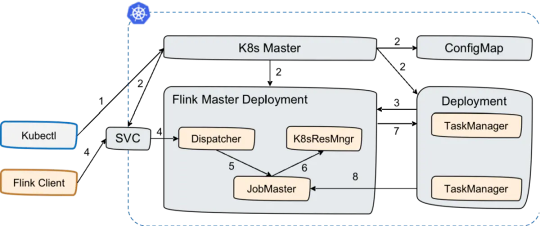● 优点:优点是无需修改 Flink 源码,仅仅只需预先定义一些 yaml 文件,集群就可以启动,互相之间的通信完全不经过 K8s Master;