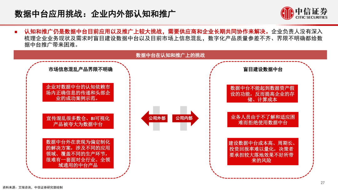 报告中提出目前数据中台在应用上仍有5大挑战:企业内外部认知和推广度低;企业遗留数据质量差治理周期长;收益指标难以量化;企业战略及组织难变革;落地成本高、人才缺乏。