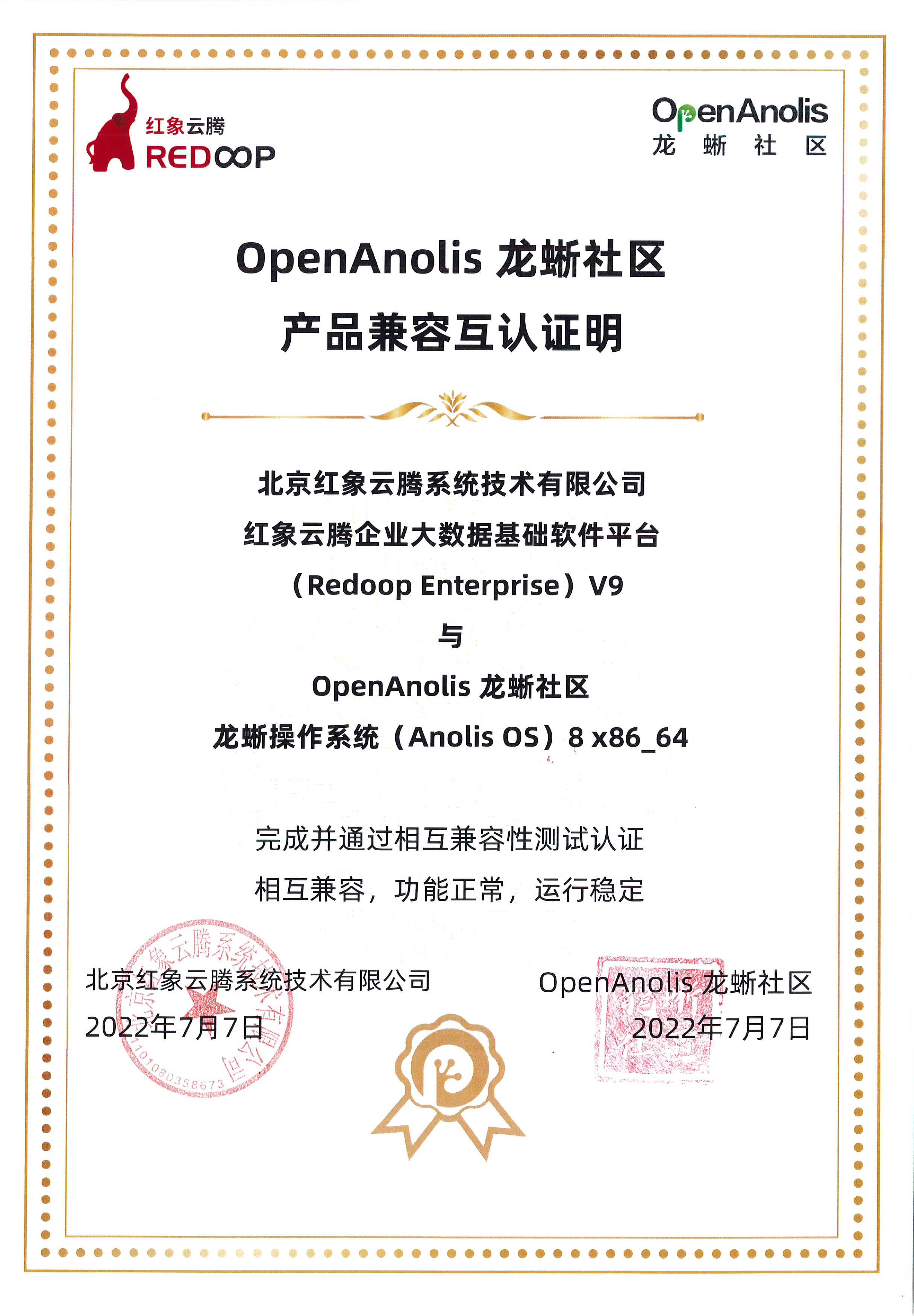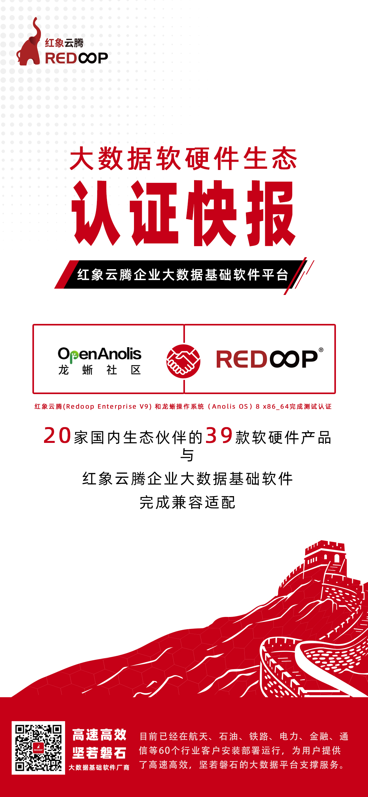 最近红象云腾大数据产品与多家生态伙伴的适配工作喜报频传,不久前,红象云腾企业大数据基础软件平台产品与龙蜥操作系统(Anolis OS)8 AArch64完成了兼容测试。近日,红象云腾与龙蜥社区工作人员再次联合严格测试,红象云腾企业大数据基础软件平台(Redoop Enterprise)V9完成了与龙蜥操作系统(Anolis OS)8 x86_64的兼容适配,完成并通过相互兼容性测试认证,相互兼容,功能正常,运行稳定。