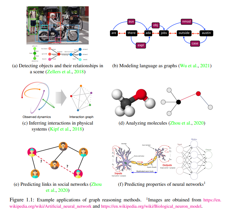 为了开发能够从原始感官数据推断组成结构的算法或预测结构属性的算法,我们首先需要定义适合于这类任务的数据抽象。在数学和计算机科学中,有一种方便的抽象专门介绍了模型的组成和关系结构。这种抽象被称为图,其中节点对应结构的组件,而边对应组件之间的交互。例如,分子通常表示为图形,节点对应原子或更复杂的元素,边对应化学键(图1.1,d)。类似地,社会网络是图形,节点是人,边是它们之间的不同类型的关系(图1.1,e)。同样地,生物或人工神经网络是一个图,其中节点可以是神经元,边可以是它们之间的连接(图1.1,f)。需要开发处理相关任务的算法。