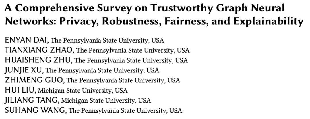 团队简介:该综述论文主要由宾夕法尼亚州立大学(PSU) 王苏杭助理教授团队协作完成。其他主要贡献作者包括戴恩炎和赵天翔。戴恩炎是来自PSU的第三年PhD学生,他目前的主要科研方向为Trustworthy Graph Neural Networks。赵天翔也是来自PSU的第三年PhD学生,他主要从事Weakly-Supervised Graph Learning方向的研究。王苏杭教授对于数据挖掘和机器学习有着广泛的兴趣,最近的研究主要集中于图神经网络的各个方向如Trustworthiness, self-supervision, weak-supervision 和 heterophilic graph learning,deep generative models和causal recommender systems。