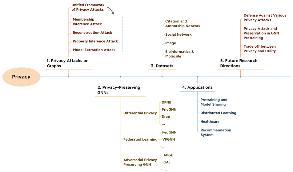 以上的这些问题都阻碍了GNNs在高风险场景如金融和医疗领域进一步的发展。因此可信赖图神经网络的构建已经成为了热门方向。在我们的综述中 [6],我们对已有的可信赖图神经网络在隐私,鲁棒性,公平性和可解释性方面进行了总结归纳,并展望了进一步的工作方向。接下来在这篇博客中,我们将简要的介绍综述的框架及所包含的具体方向。