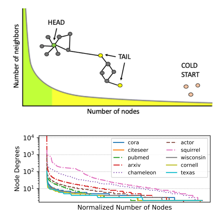 但是,许多现实世界图中存在的长尾节点度分布。具体来说,节点度分布本质上是幂律分布,大多数节点的连接很少。许多信息检索和推荐应用都面临严格冷启动(Strict Cold Start, SCS)的场景, 其中一些节点没有连接的边。诚然,预测这些节点比图中的尾节点更具挑战性。「在这些情况下,由于邻域的稀疏性或缺失,现有的 GNN 表现不佳。」