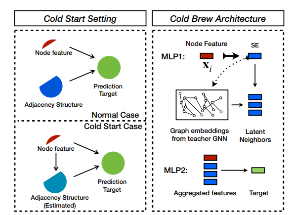 Cold Brew 框架解决了两个关键问题:-(1)如何有效地提炼教师的知识以进行尾部和冷启动,以及(2)学生如何利用这些知识。作者通过使用知识蒸馏学习潜在的节点嵌入来回答这两个问题,这既避免了“过度平滑”,又发现了潜在的邻域, SCS 节点缺少这些。与传统的知识蒸馏(Hinton et al., 2015)相比,本文的目标不是训练一个更简单的学生模型来像更复杂的教师一样执行。相反,是训练一个在泛化到尾部或 SCS 样本方面优于教师的学生模型。