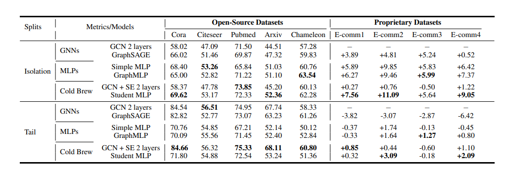 从这个定理中,我们也可以看到引入像 Cold Brew 学生模型那样的邻域聚合的必要性。如果在没有邻域聚合的情况下直接应用 MLP 模型,则 i 是不可忽略的,导致标签预测的损失更大。但是,Cold Brew 引入了邻域聚合机制,以便学生 MLP 的第二部分接管第一个 MLP 生成的邻域聚合。因此,即使在没有实际邻域的情况下,Cold Brew 也能消除上述残差