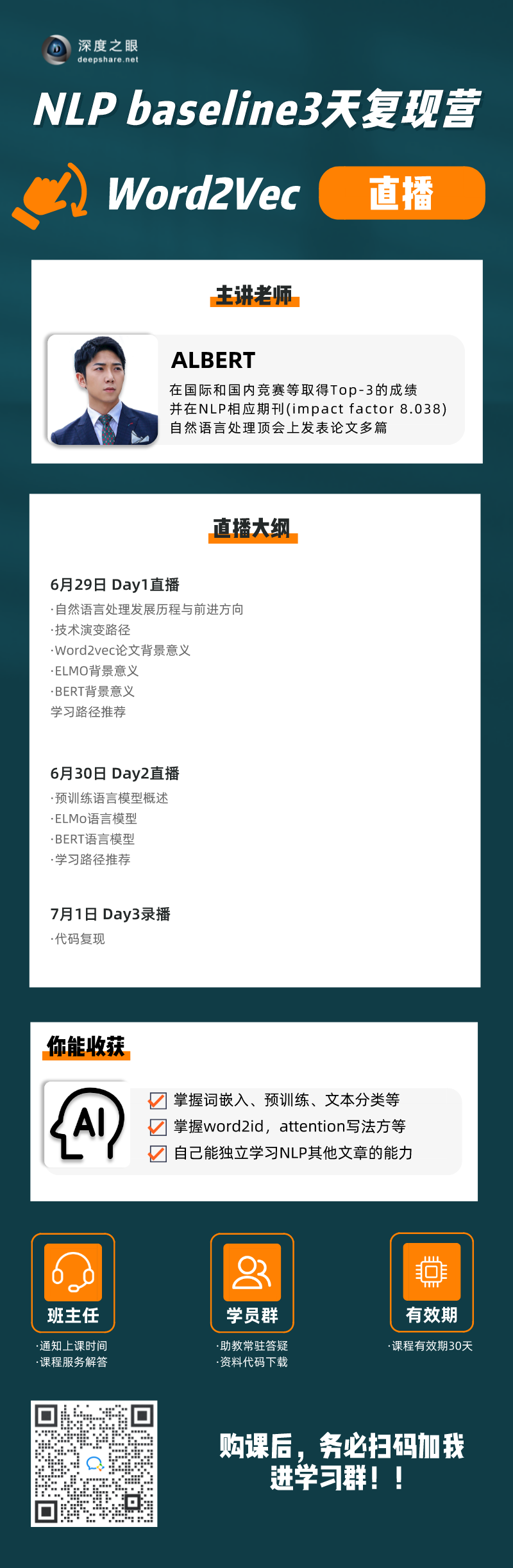 我请到了中科院博士Albert,推出NLP Baseline Paper 精讲直播,为期2天,主讲Word2Vec以及ELMO,BERT。