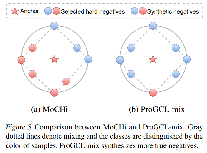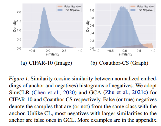 最近的研究表明,难的负样本(与锚点样本更相似的负样本)可以提高对比学习的表现。然而,作者发现现有的其他领域的难负样本挖掘技术并不能很好地促进图对比学习(参见原文Table 5)。作者对此现象进行了实验和理论分析,发现可以归因于图神经网络的消息传递机制。如果像其他领域那样仅仅把相似度做为衡量负样本难易程度的指标,在图对比学习中大多数的难负样本是潜在的假负样本(与锚点样本同一类, Figure 1)。为了弥补这一缺陷,作者利用混合分布来估计负样本为真负样本的概率,并设计了两种方案(即 ProGCL-weight 和 ProGCL-mix)来提高 GCL 的性能。