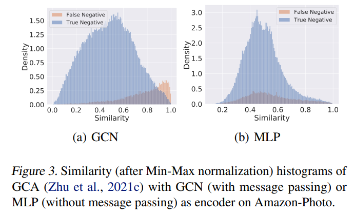 为了探究消息传递机制在图对比学习中的作用,作者将图对比学习中的GCN替换为MLP(即去掉信息传递机制),发现负样本的分布呈现与其他领域相似的单峰分布。这说明消息传递机制是造成上述现象的本质原因。但是,直接去掉消息传递机制又不能很好地利用图的结构信息。图神经网络的消息传递机制会拉近邻近节点的表征,即增大很多对假锚点样本与假负样本的相似度。进一步导致图对比学习的负样本的分布呈现双峰分布。