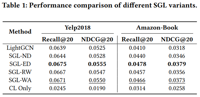 在SGL[1]上作者进行了如下实验,探究图结构扰动在图对比学习中的作用,ND为节点dropout,ED为边dropout,RW为随机游走,WA不进行数据增广(这里两个视图都用原始embedding)。可以发现,不进行数据增广的情况下,只比增强低一点,说明其作用很小。