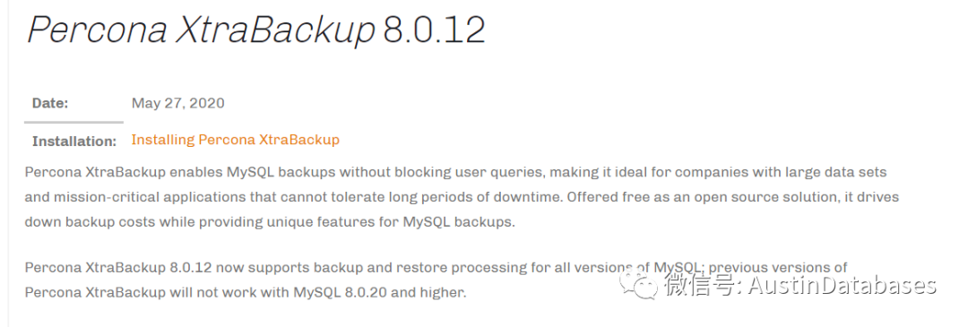 MYSQL8 版本频繁的更新,实际上牵扯是否能使用MYSQL的一个选择性的问题上,XTRABACKUP 是一个考虑能否正常使用MYSQL 8 新版本的问题。数据库不能没有备份,XTRABACKUP 也往前推进了版本到了8.0,8.0这个版本不会在支持8.0之前的MYSQL,主要是因为REDO ,UNDO 本身在MYSQL 5.7和8.0 之间有了本质的不同和变化。所以备份软件也需要进行相关的改变。