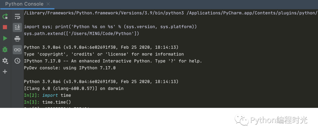接着 PyCharm 就会弹出一个 Python Console 窗口,然后运行你所选择的代码。
