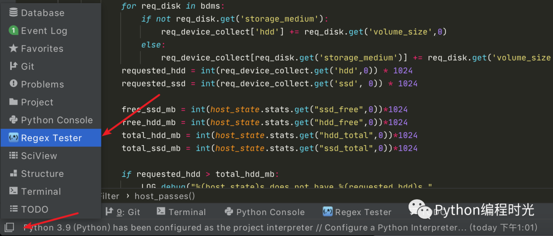 安装完成后,无需重启 PyCharm ,点击 PyCharm 界面左下方的小矩形按钮,就能找到 Regex Tester 选项。