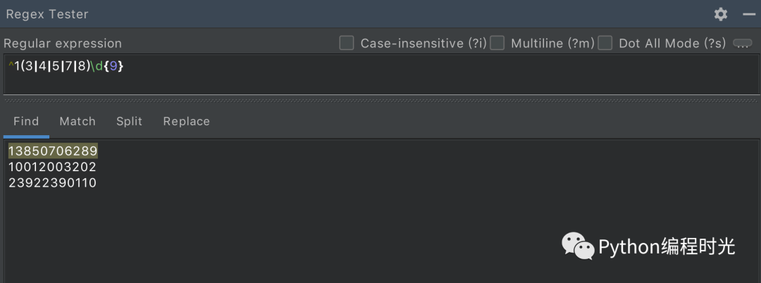 点击进入后,就出现了如下界面。我随手写了个匹配手机号码的正则(不一定准确),匹配到的字符串背景会被高亮。右上方还有一些选项如大小写敏感,多行模式等,可根据需要进行选择。Regex Tester 还提供了Split,Replace功能等。