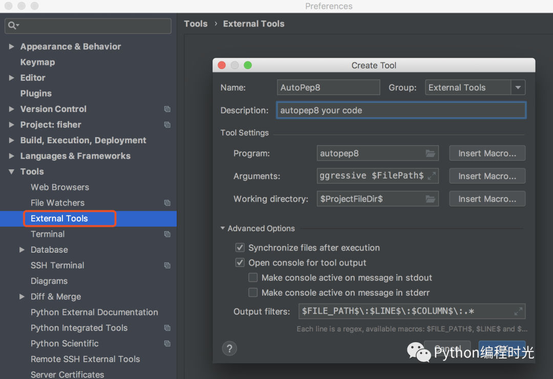 Name: AutoPep8Description: autopep8 your codeProgram: autopep8Arguments: --in-place --aggressive --aggressive $FilePath$Working directory: $ProjectFileDir$Output filters: $FILE_PATH$\:$LINE$\:$COLUMN$\:.*