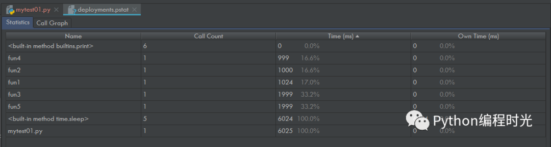 从图中可以看出Test.py直接调用了fun3、fun1、fun2和fun5函数;fun5函数直接调用了fun4函数;fun1、fun2、fun3、fun4和fun5都直接调用了print以及sleep函数;整个测试代码运行的总时间为6006ms,其中fun3的运行时间为1999ms,所占的时间百分比为33.3%,也就是 1999ms 6006ms = 33.3%。