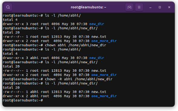 root@learnubuntu:~# chown -R abhi /home/abhi/new_dirroot@learnubuntu:~# ls -l /home/abhi/new_dir/total 20-rw-r--r-- 1 abhi root 12813 May 30 07:30 new.txtdrwxr-xr-x 2 abhi root 4096 May 30 07:30 one_more_dir