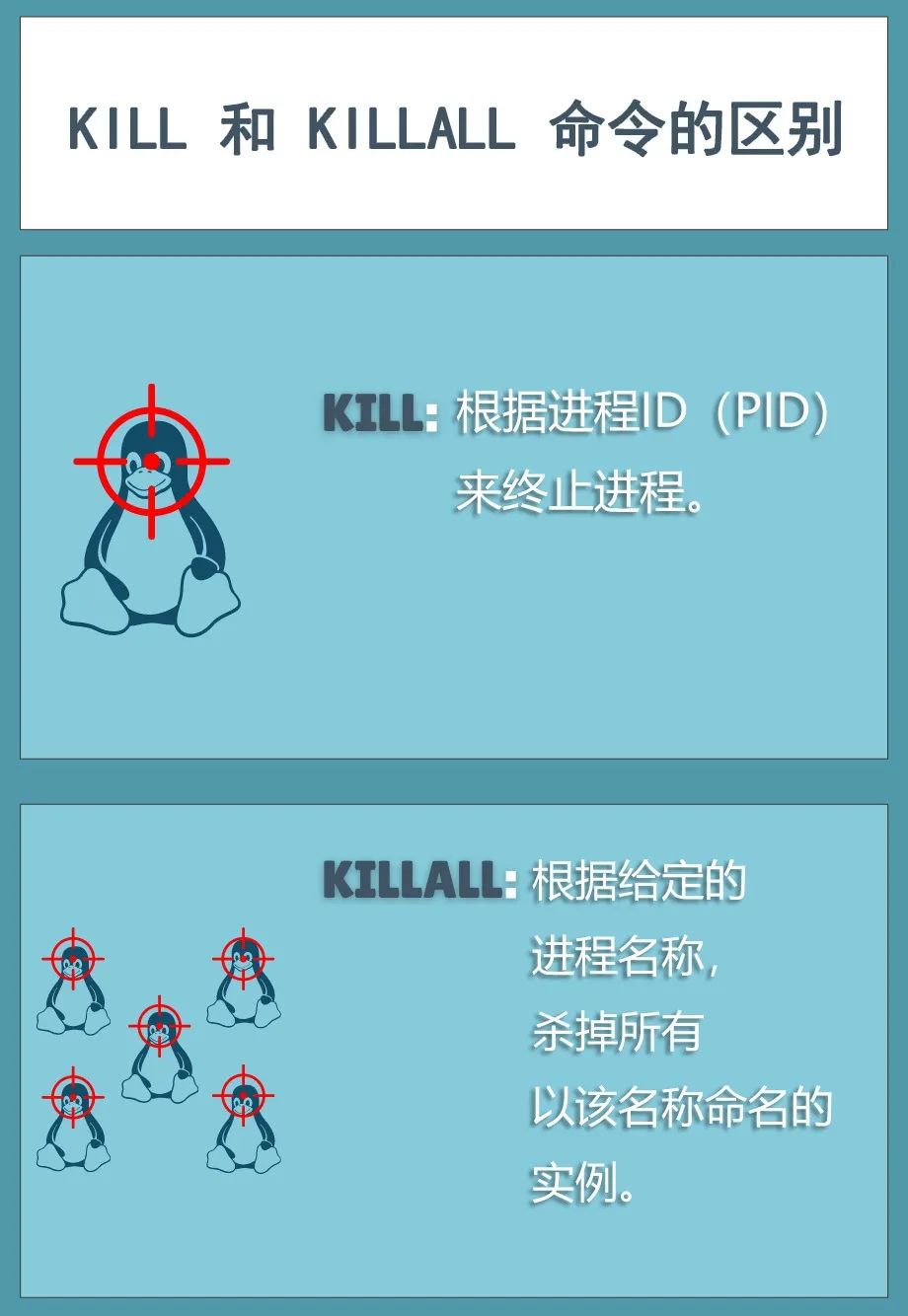 简单地说,kill 命令与 PID(通常是单个 PID)一起使用,killall 命令与进程名称一起使用,并使用进程名称杀死所有进程。