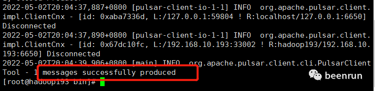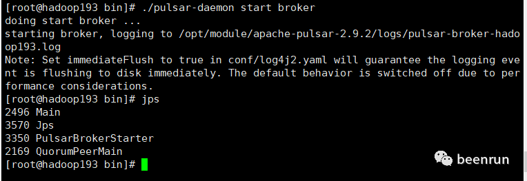 doing start bookie ...starting bookie, logging to opt/module/apache-pulsar-2.10.0/logs/pulsar-bookie-hadoop191.logNote: Set immediateFlush to true in conf/log4j2.yaml will guarantee the logging event is flushing to disk immediately. The default behavior is switched off due to performance considerations.[root@hadoop191 bin]#