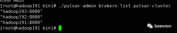 cd opt/module/apache-pulsar-2.10.0/bin[root@hadoop191 bin]# ./pulsar-admin brokers list pulsar-clusterhadoop193:8080hadoop192:8080hadoop191:8080[root@hadoop191 bin]#