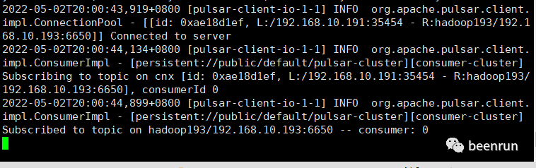 ./pulsar-client consume \persistent://public/default/pulsar-cluster \-n 100 \-s "consumer-cluster" \-t "Exclusive"